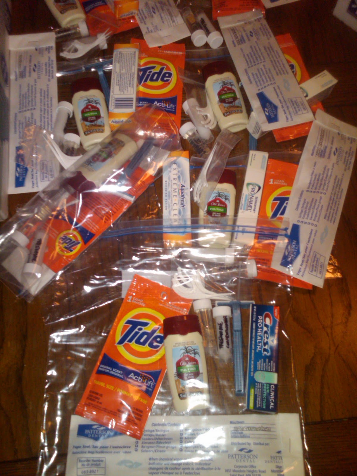 I have so much extra freebies that I have put together a few toiletry "care" bags