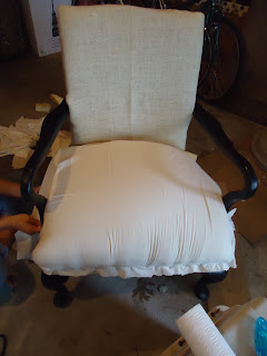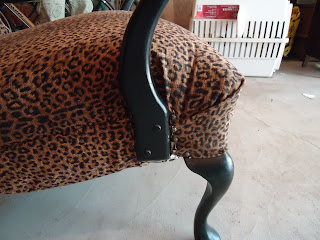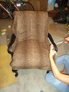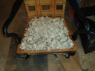 Step 1: Strip chair of old material & sand down arms & legs then paint them semi-gloss black.